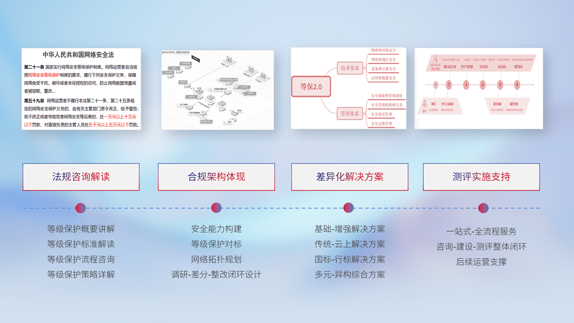 通过专业的法律咨询解读、、、合规架构体现、、差异化解决方案、、、、测试实施支持等服务,,,为客户量身打造等保合规体系。。。